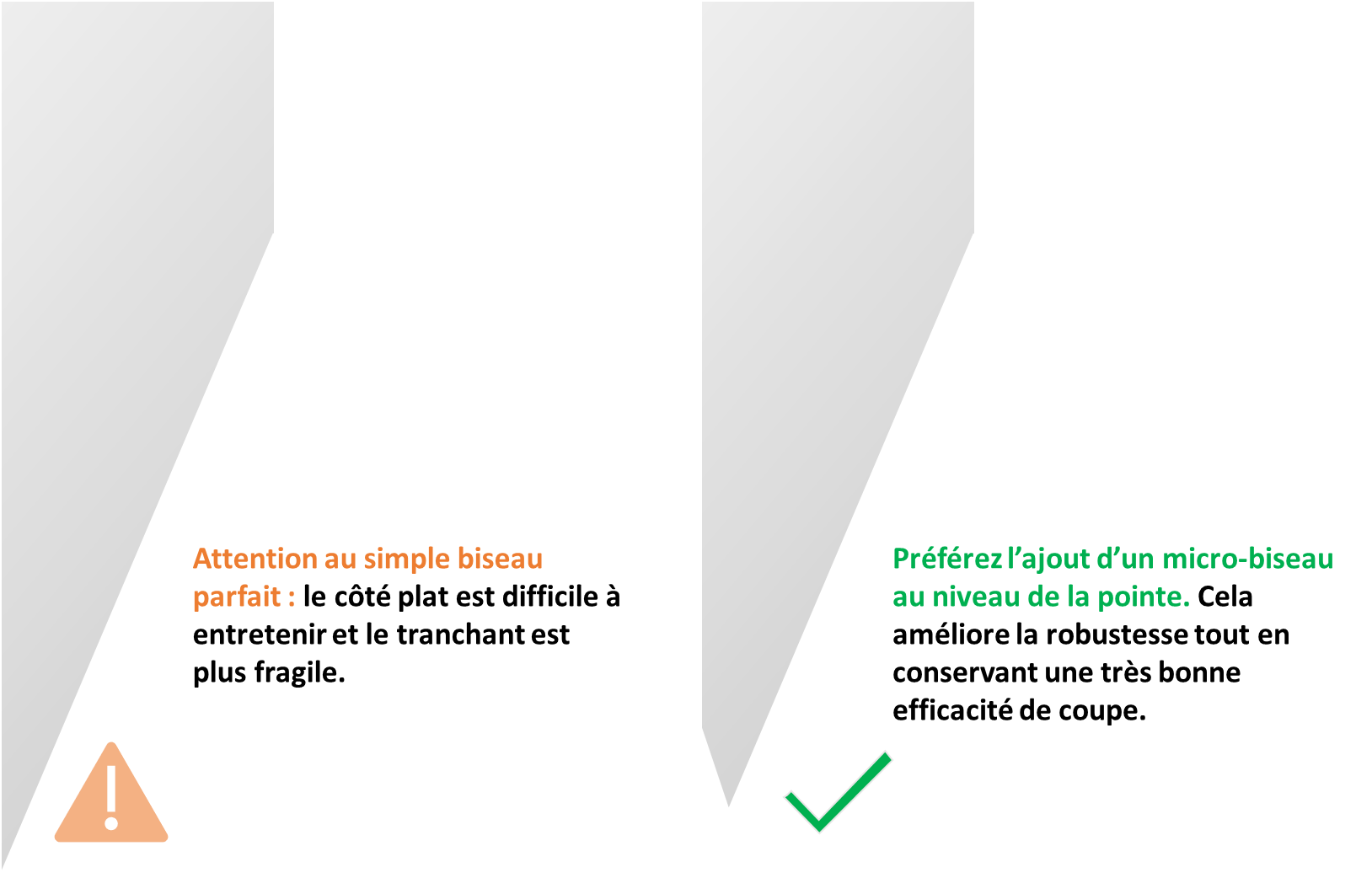 Pourquoi l’efficacité est conservée : la surface du micro-biseau étant très courte, son frottement avec la matière est négligeable.