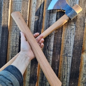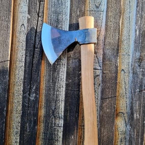 Une hache Trento Rinaldi de 900g, utilisable avec un manche long pour les travaux à deux mains, ou un manche court pour la sculpture, la fente de petit bois et autres petits travaux.